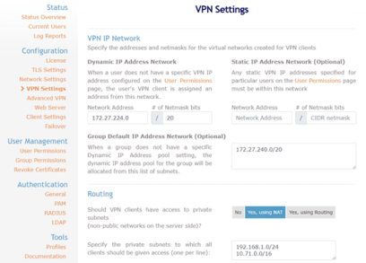 - OpenVPN is configured with subnets that VPN users are allowed to access. 192.168.1.0/24 and 10.71.0.0/16 are the two allowed subnets. OpenVPN configures the SSL VPN tunnel to route to these two subnets.