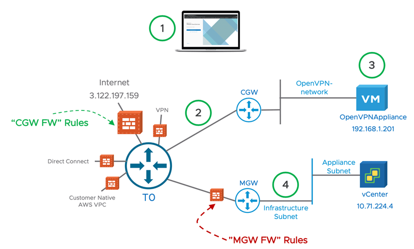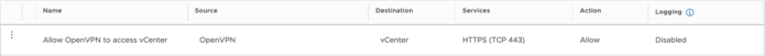 | 1 | Allow the OpenVPN appliance to access vCenter only on port 443 | OpenVPN appliance | vCenter | HTTPS | Allow |