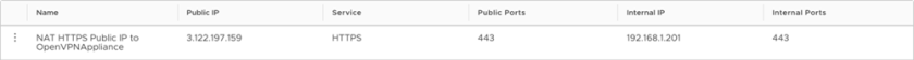 | NAT HTTPS Public IP to OpenVPN appliance | 3.122.197.159 | HTTPS | 443 | 192.168.1.201 | 443 |