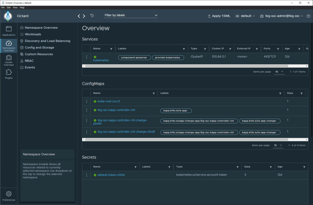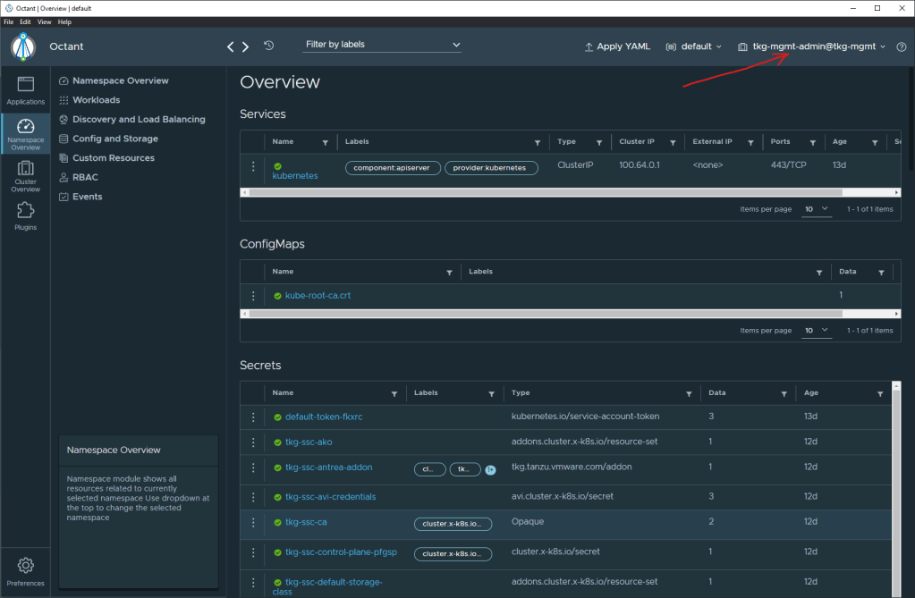 As soon as you launch Octant, it will default the view to the first context in the kube config file. For my setup, this is the tkg-mgmt context which is a TKGm management cluster.