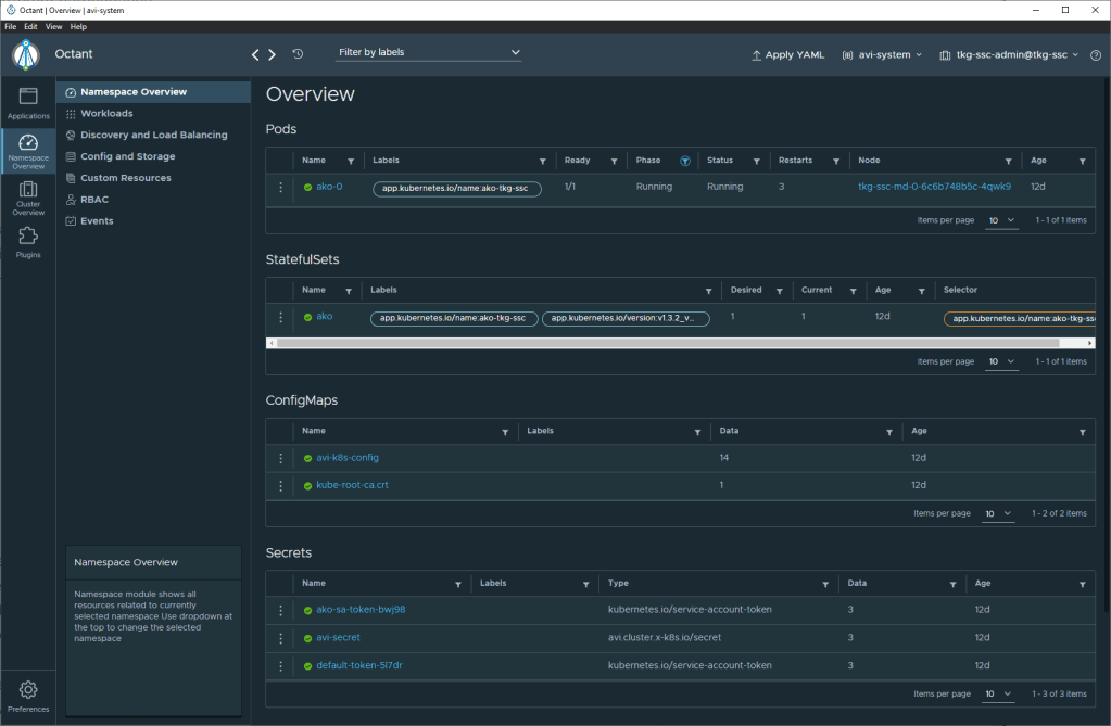As an example, here is a single view of the AKO config that I wrote about a few articles ago. This shows the avi-system namespace in the tkg-ssc cluster. You can see that there is the ako-0 pod that enables Kubernetes Ingress to the tkg-ssc cluster as well as other resources.