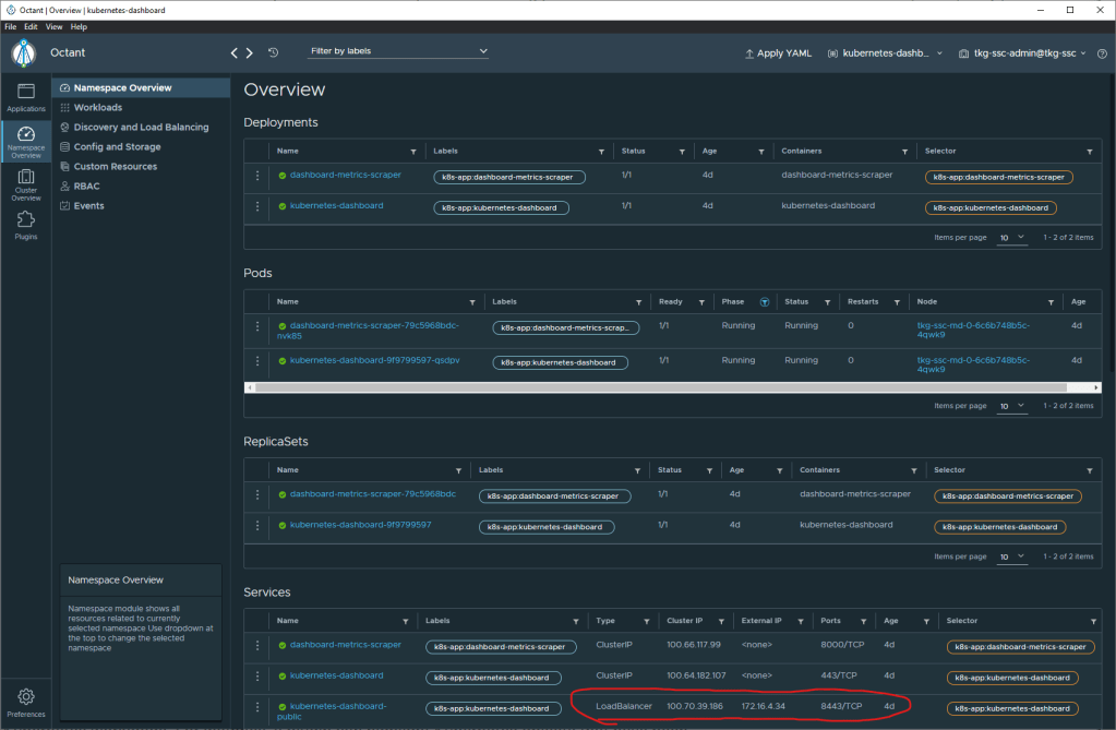 Octant provides a nice view here, you can now see that the external ip for kubernetes dashboard is running on 172.16.4.34. Which is a lot simpler to obtain using Octant than running the command below