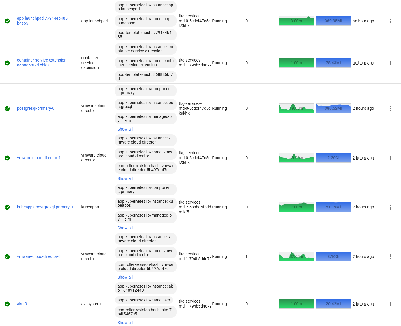 Notice that the two PostgreSQL pods together are only using 700 Mb of RAM. The VCD pods are consuming much more. But a vast improvement over the 6GB that one appliance needed previously.