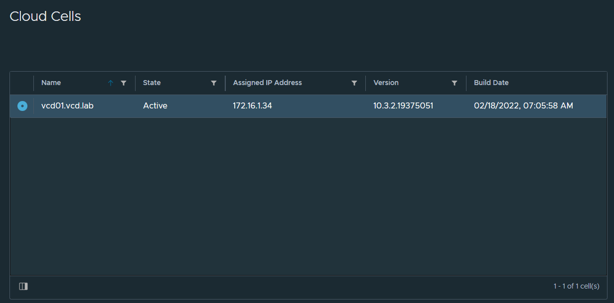Here’s a view of the current VCD appliance in the portal. 172.16.1.34 is the IP of the appliance, 172.16.1.0/27 is the network for the NSX-T segment that I’ve created for the VCD DMZ network. At the end of this post, you’ll see VCD running in Kubernetes pods with IP addresses assigned by the CNI instead.