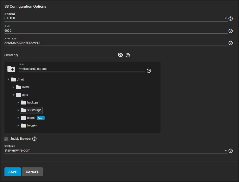 I’m using TrueNAS’ S3 compatible storage in my lab. TrueNAS is an S3 compliant object storage system and is incredibly easy to setup. You can use other S3 compatible object stores such as Amazon S3. A full list of supported providers can be found here.