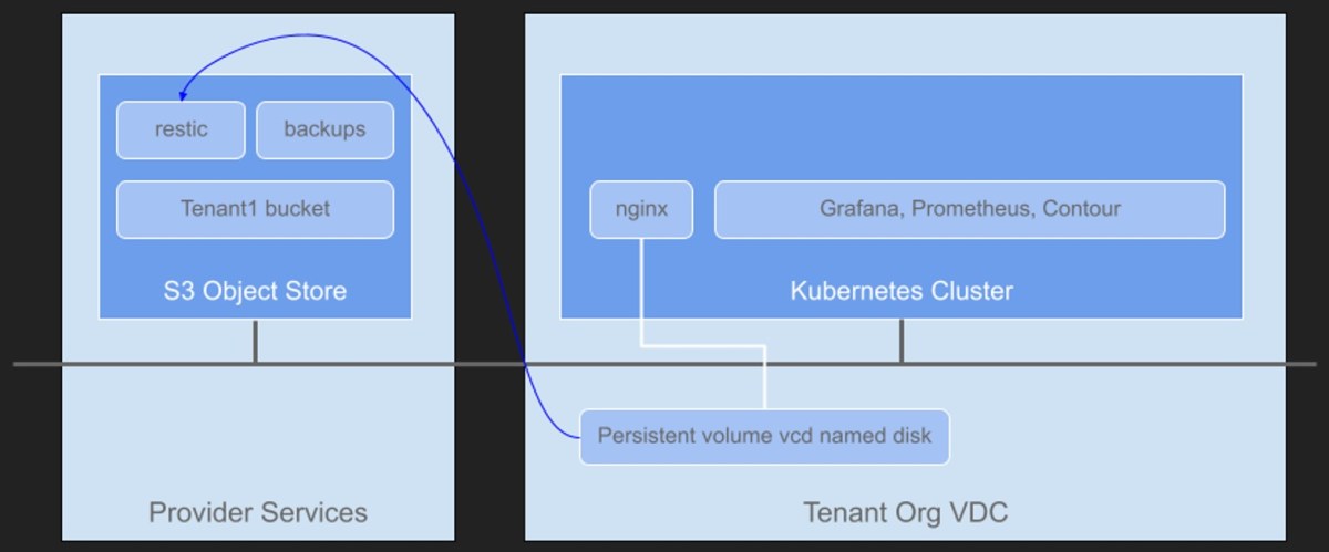Specify the bucket with the --bucket flag, I’m using tenant1 here to correspond to a VCD tenant that will have its own bucket for storing backups in the Kubernetes cluster.