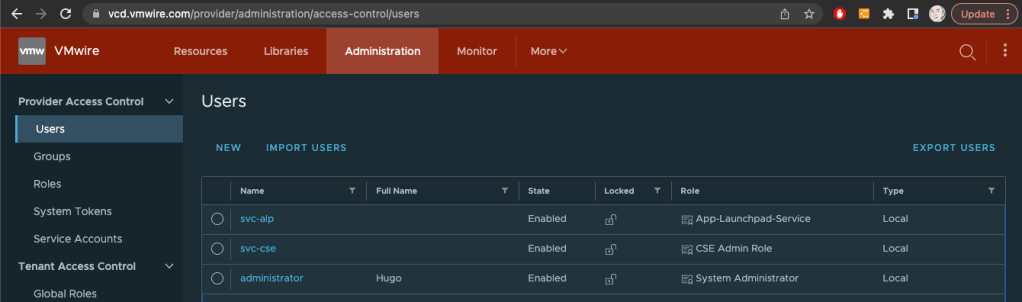 Log out of VCD and log back into the Provider organization as the service account you created in Step 1 above. Once logged in, it should look like the following screenshot, notice that the svc-cse user is logged into the Provider organization.