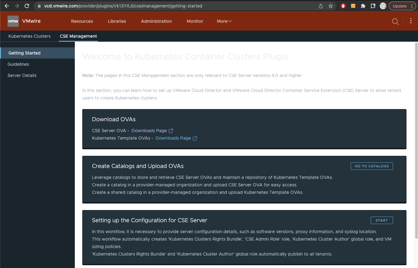 Create a new tenant Organization where you will run CSE. This new organization is dedicated to VCD extensions such as CSE and is managed by the service provider.