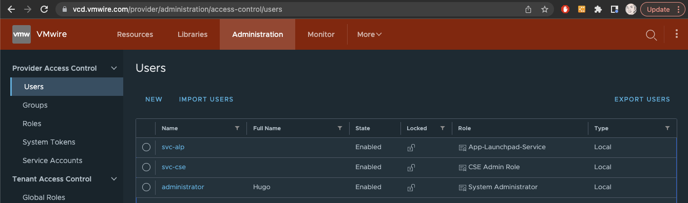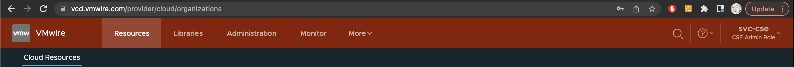 Log out of VCD and log back into the Provider organization as the service account you created in Step 1 above. Once logged in, it should look like the following screenshot, notice that the svc-cse user is logged into the Provider organization.