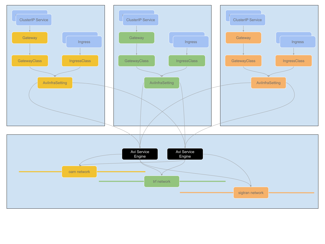 and the ClusterIP type tells the Avi Kubernetes Operator (AKO) to use the gateways, each gateway is on a separate network segment for traffic separation.
