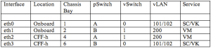 Interface is the network adapter inside a blade, Location is where the interface is, Chassis Bay is where the interface terminates at the rear of the BladeCenter chassis, pSwitch is the external core switch that the Chassis Bay uplinks to, vSwitch is the ESX virtual switch that the Interface provides an uplink for, vLAN is the ID that is assigned to each Port Group and Service is the type of port group assigned to a vSwitch.