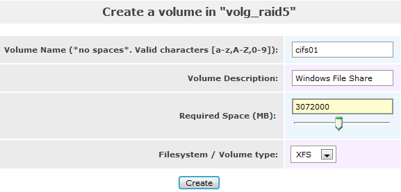 We can manage this by using the Add Volume page. I’m going to add a new 3Tb CIFS volume for my Windows file storage.