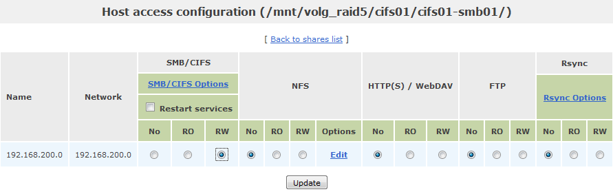- Now scroll all the way down to the bottom and configure the Host access configuration to the /mnt/volg_raid5/cifs01/cifs01-smb01/ Volume. Choose the options relevant to your environment, I’m making this share R/W accessible by all my devices in my network – 192.168.200.0/24. Then just click on Update to finish.