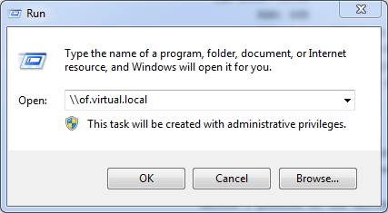 The SMB share is now ready to be used by client computers. To connect just open a UNC path to it. of.virtual.local is the FQDN of my Openfiler Server.