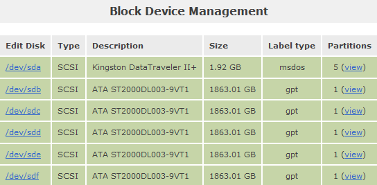 Openfiler has successfully picked up the 5 new disks and we can now manage them.