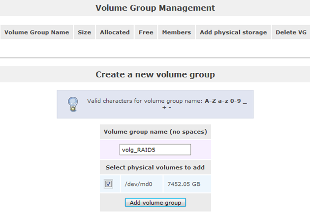 We can create the Volume Group by navigating to Volumes | Volume Groups.