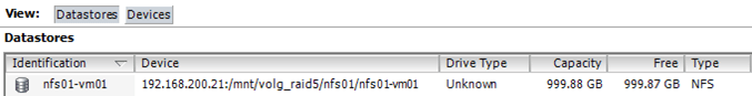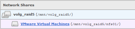 The NFS volume is now ready to be mounted by VMware vSphere hosts. Just use /mnt/volg_raid5/nfs01/nfs01-vm01 as the “Folder” mount point.