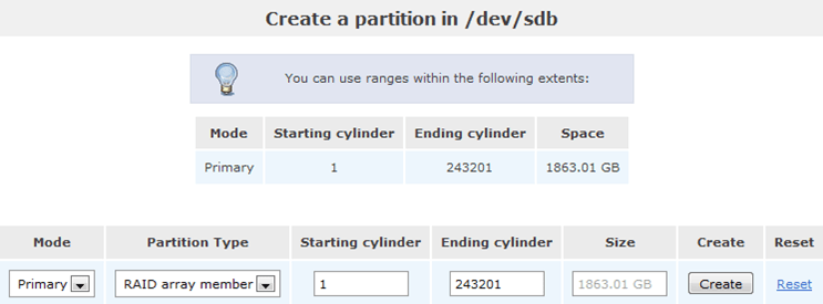 - Select RAID array member from the Partition Type drop down menu and then just click on Create.