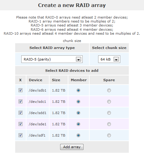 To do this you must click in each of the block devices and create a “RAID array member” partition. Remember to leave /dev/sda alone as this is the boot device.