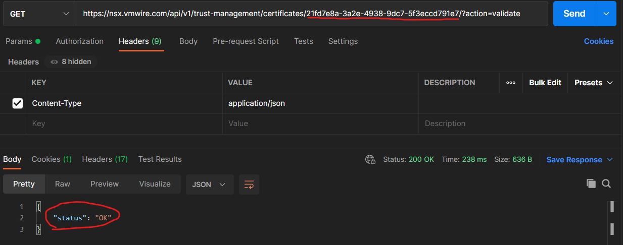 First lets validate that our certificate is OK by using this GET against the NSX-T API, paste in the certificate ID into the URL.